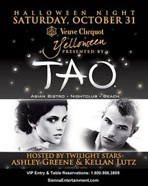 Spotted in the crowd scoping out the location of their upcoming Halloween bash were Twilight stars Ashley Greene and Kellan Lutz, who headed straight for TAO after arriving in Vegas. The co-stars had dinner and Greene sampled the signature Tao Tini, then hit the club for the sounds of DJ Five and the surprise performance by Gibson. The two will host Veuve Clicquot’s Yelloween at TAO on Saturday.